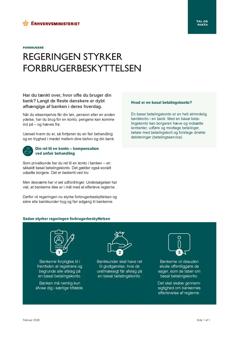 Regeringen vil med udspillet sikre, at både privatpersoner og mikrovirksomheder fremover vil kunne se en samlet oversigt over alle deres bankomkostninger i fx netbanken. Samtidig vil forbrugerne få tidligere og mere relevante oplysninger ved lån. Det indskærpes desuden, at forbrugerne som hovedregel skal varsles mindst én måned før rentestigninger. Ydermere styrkes forbrugerbeskyttelsen omkring basale betalingskonti, og det gøres lettere at sammenligne produkter mellem banker.