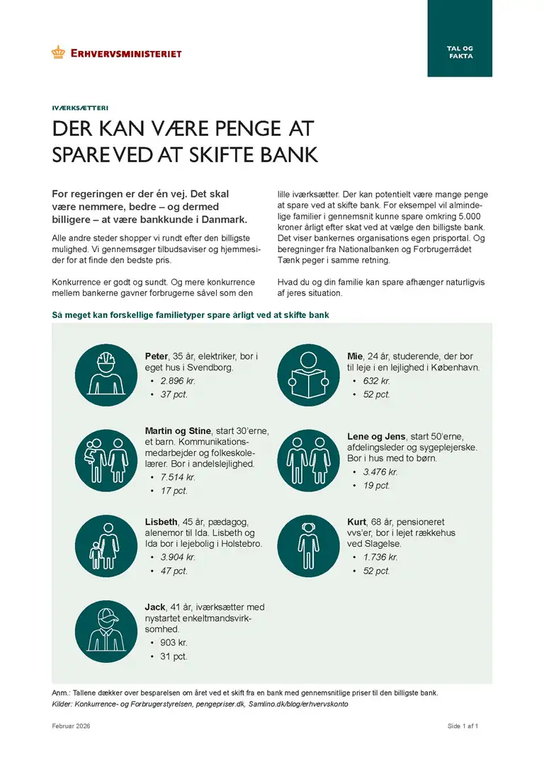 Det skal være nemmere at være bankkunde i Danmark. Konkurrencen halter, og når man vil tjekke og sammenligne priser fanges man i en uendelig labyrint af informationer. Det rammer både danskerne og virksomheder på pengepungen. Derfor sætter vi nu danske bankkunders behov i fokus. Med 11 nye initiativer vil vi sætte skub i konkurrencen og gøre det nemmere for danske bankkunder at vælge til og fra. Det er et stort skridt i den rigtige retning, som vil give danskerne flere penge mellem hænderne.
